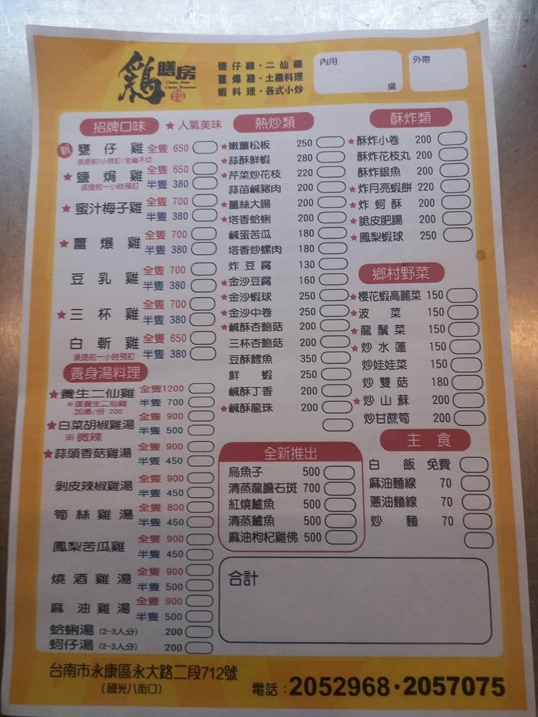 主打雞料理與熱炒類(熱炒約3-4人份),價格親民,且提供免費白飯